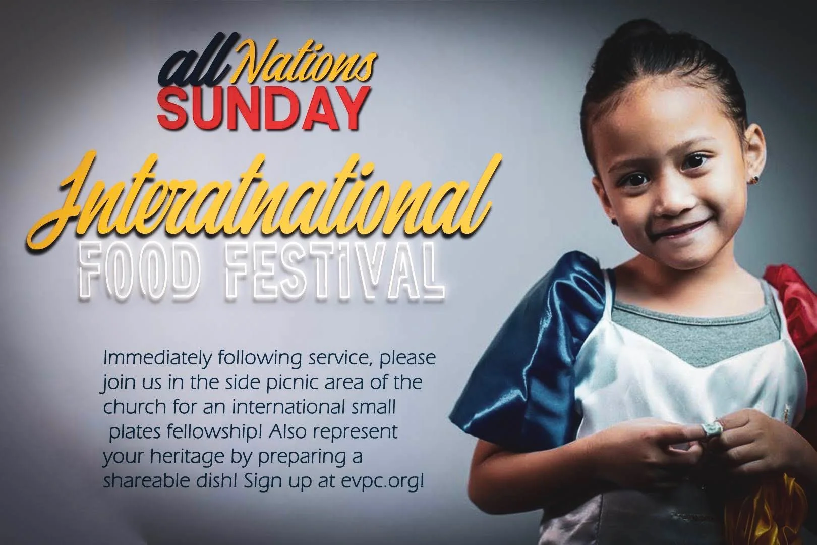 Join us Sunday Oct. 18th at 10am as we celebrate the many nations that have come together to make the body of the church what it is today. All Nation Sunday is a great opportunity to highlight, recognize, and rejoice all that God has been doing not just in our country, but throughout the globe! Come be apart by signing up below to carry your nation’s flag or by bringing a “finger food” type dish to share the taste of home with all who are in attendance.