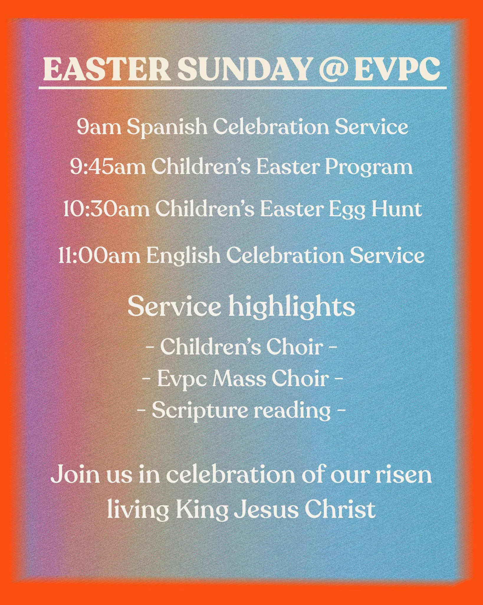 You and your entire circle of family, friends, co-workers, neighbors, and anyone living are welcome to come celebrate the Good News of Easter with us at EVPC!