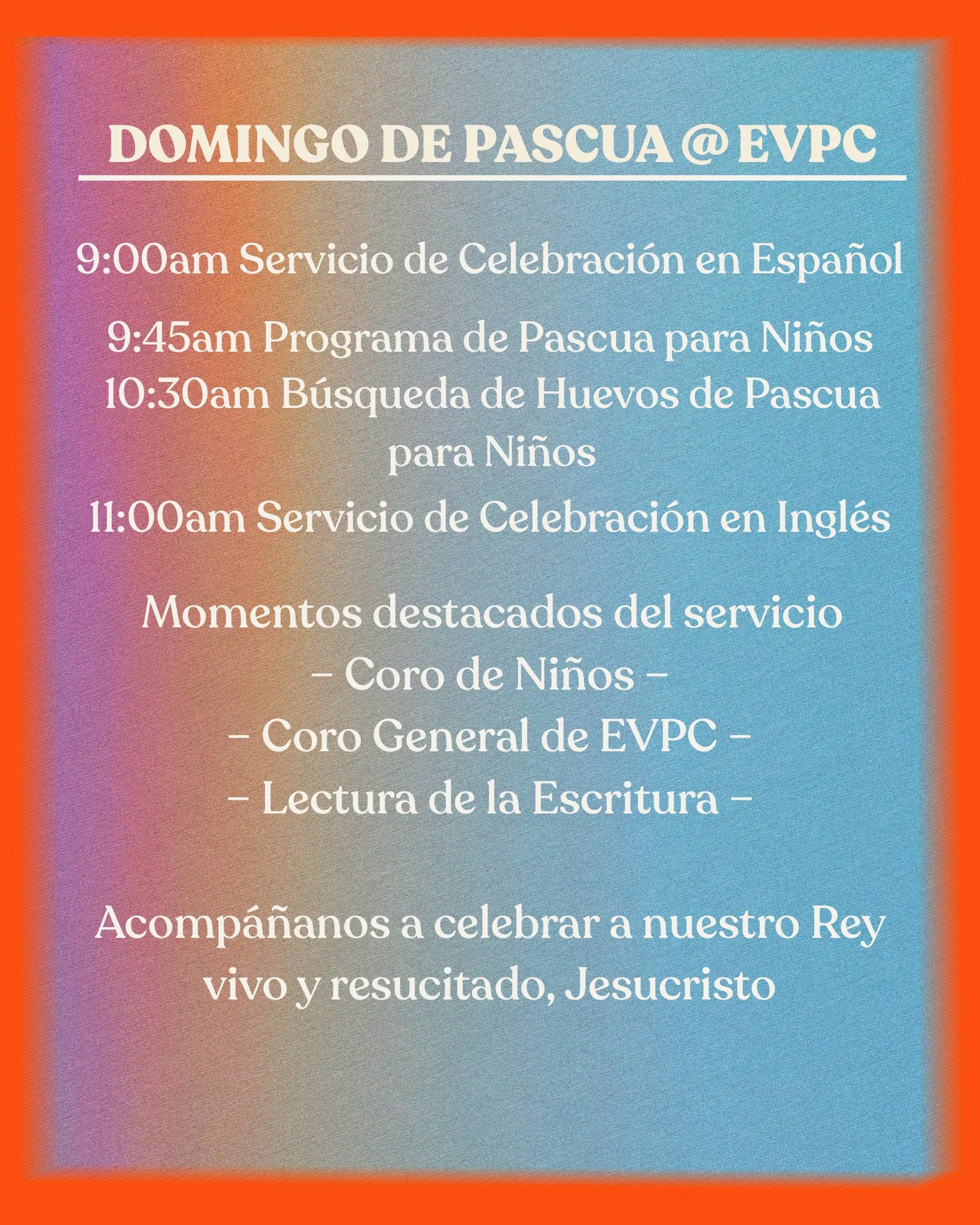 Tú y todo tu círculo—familia, amigos, compañeros de trabajo, vecinos, y todos—¡están invitados a celebrar con nosotros las Buenas Nuevas de la Pascua en EVPC!